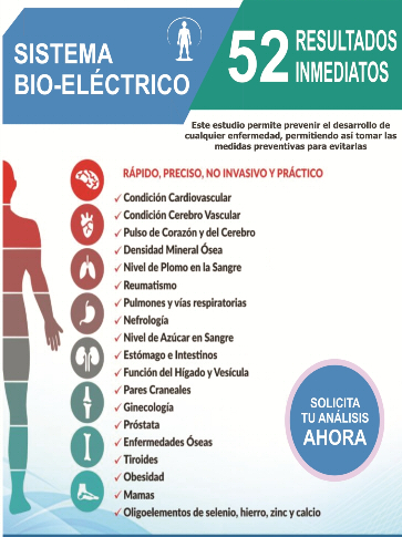 1. Completo: Análisis de múltiples parámetros de salud tales como el estado funcional de órganos (hígado, pulmones, riñones, corazón, etc), equilibrio nutricional (vitaminas, minerales, etc), sistema óseo, circulatorio, inmunológico y endocrino, energía celular, tendencias inflamatorias o degenerativas, alergias, metales pesados y más.